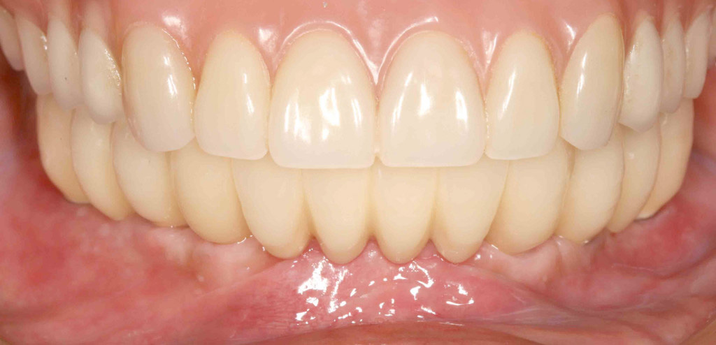 下顎は、6本のインプラントを利用したワンピースのジルコニアによるオールセラミックのブリッジで固定式の治療をしました。